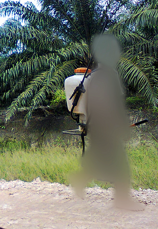 Because of acidic soils and tropical climate, agrochemicals (fertilizers and herbicides) are considered a requisite for good palm oil production. Above left, workers on a palm oil plantation in Papua, Indonesia, apply fertilizer. Above right, a young worker heads into the plantation in Sumatra to spray herbicides on the trees and fruit. He wears no protective gear. The herbicide he is spraying is Paraquat, a neurotoxic herbicide known to cause liver and kidney damage that is banned in 32 countries. This child told the Schuster Institute's team of reporters he was expected to spray two hectares of land every day and said he does not go school. Paraquat and Glyphosate (Roundup) are the two most common herbicides used in the management of palm oil plantations.