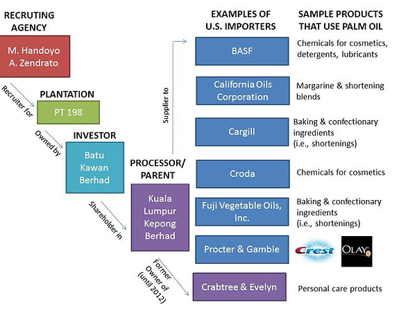 For example, the Schuster Institute found that Kuala Lumpur Kepong Berhad (KLK), the company buying and refining the palm oil harvested on PT 198 plantation in Berau where workers told Schuster Institute investigative reporter E. Benjamin Skinner they were held against their will and sometimes forced into debt bondage, has sold palm oil or its derivatives to major manufacturing companies such as the agribusiness company Cargill, the chemical manufacturing giant BASF, and the multi-national personal care corporation Procter & Gamble. These companies then either further refine and sell that palm oil to end-use manufacturers or directly use the palm oil as an ingredient in a recognizable product on supermarket shelves.