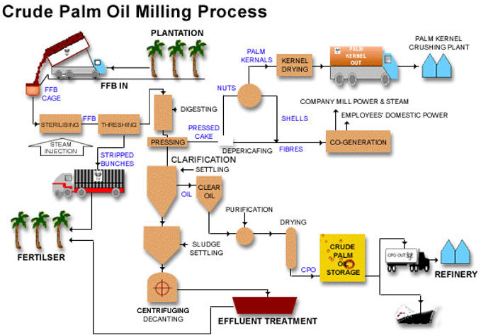 Above is a diagram of the milling process from fresh fruit bunches (FFB) to crude palm oil (CPO). "The Palm Oil Industry in Malaysia: From Seed to Frying Pan" by Teoh Cheng Hai (2002) for the World Wildlife Fund provides a good explanation of key processes and end uses.