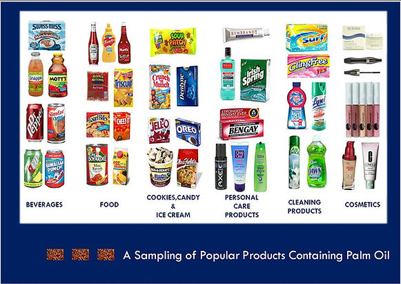 Companies purchase palm oil and its derivatives to use in the manufacture of thousands of popular food items and common household products such as the ones shown above. Learn more about products with palm oil.