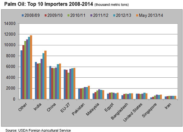 In 2012, India was the top importer of palm oil with 8.5 million metric tons, followed by China with 6.5 million metric tons, according to the USDA.